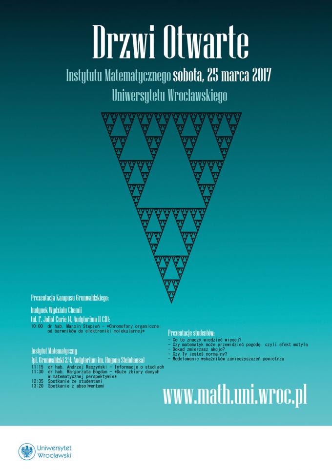 08/03/2017 • spotkania Zapraszamy na Drzwi Otwarte Instytutu Matematycznego UWr, które odbędą się w sobotę 25 marca 2017 r. w ramach Kampusowych Drzwi Otwartych. Wspólny kampusowy początek o 10:00 na Wydziale Chemii, u nas zaczynamy o 11:15. Szczegółowy program Inne wydarzenia na Wydziale Matematyki i Informatyki