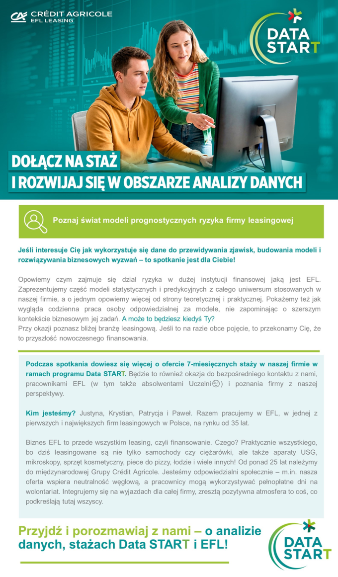 Podczas spotkania zostanie też zaprezentowana oferta 7-miesięcznych staży w firmie EFL w ramach programu DATA START: staż w Departamencie Polityki Ryzyka – monitoring, staż w Departamencie Polityki Ryzyka – scoring.